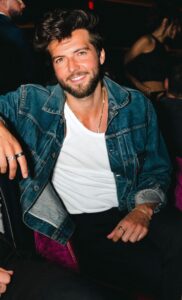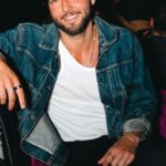 Guy Burnet smiling at a 2025 event, wearing a denim jacket and white T-shirt.